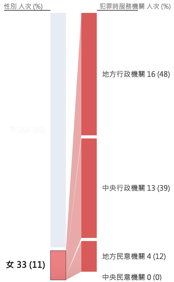 涉案類別中營建、警政、行政各佔了1成以上的比例,是較多的類型,有部分類型是只有男性人員,例如國營事業、外交事務等。